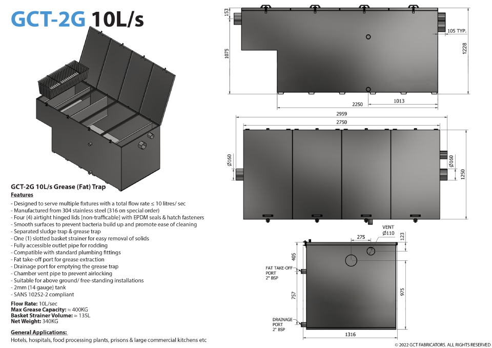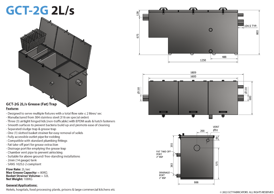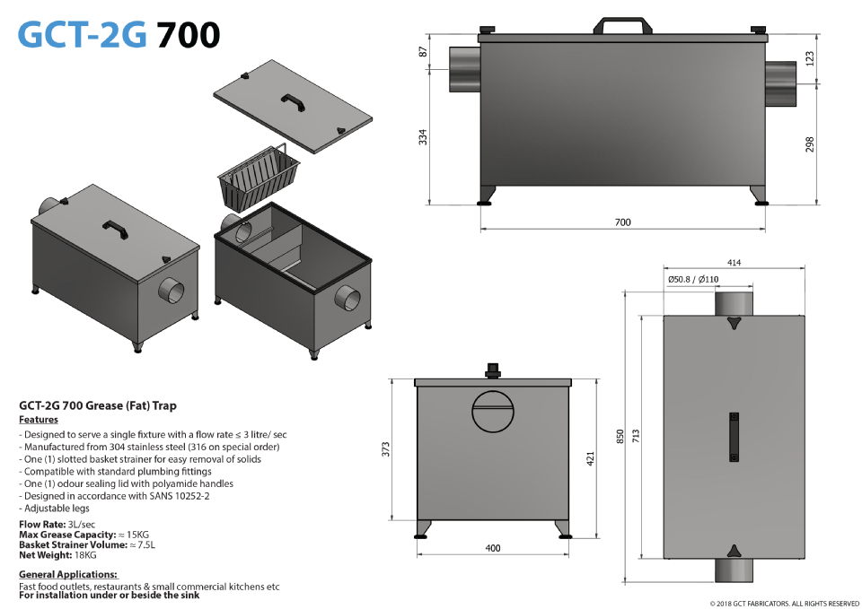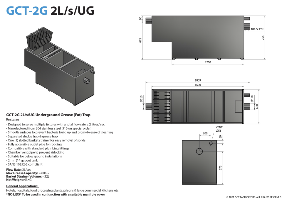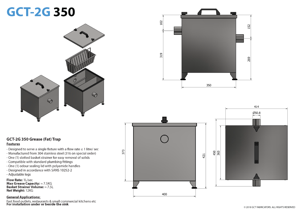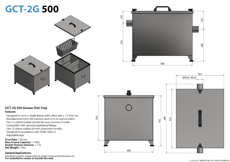 GCT grease traps have been designed in accordance with SANS 10252-2 and are made from high quality stainless steel making them resistant to any form of corrosion and stain. All GCT grease traps have been designed by industry professionals and are manufactured in our factory under careful supervision, after which each product is inspected for welding and assembly defects.