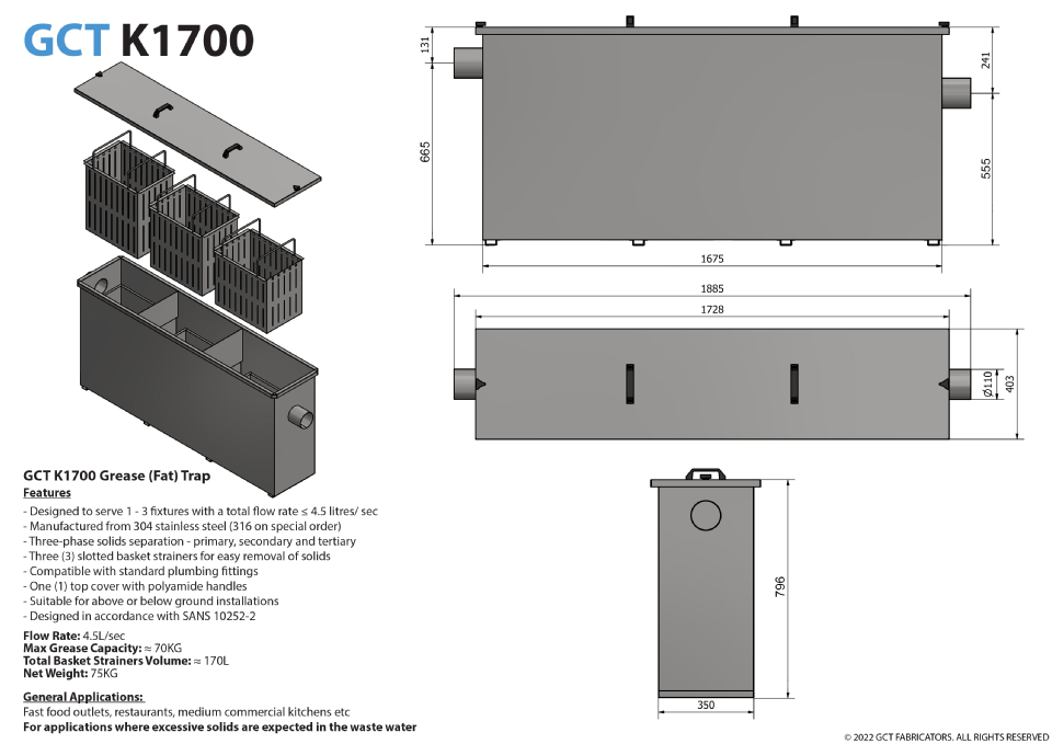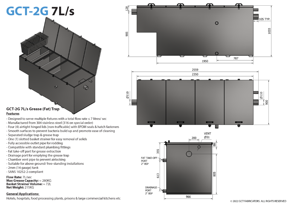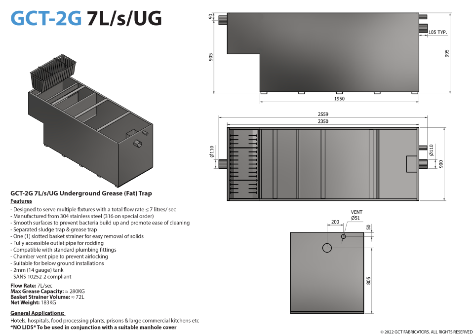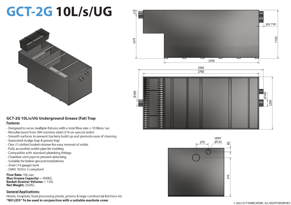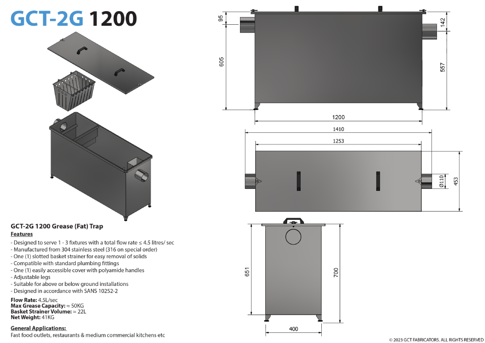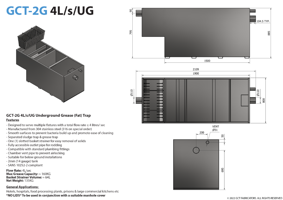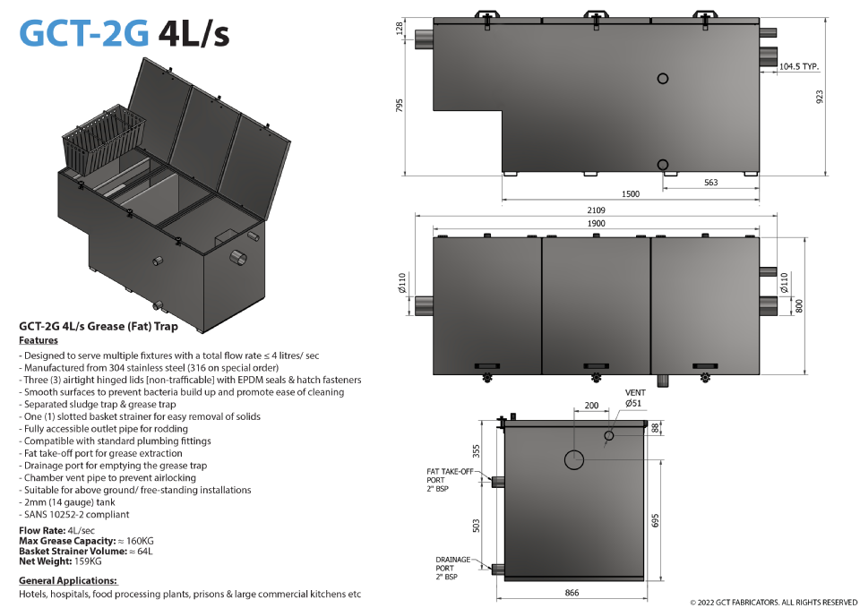 GCT grease traps have been designed in accordance with SANS 10252-2 and are made from high quality stainless steel making them resistant to any form of corrosion and stain. All GCT grease traps have been designed by industry professionals and are manufactured in our factory under careful supervision, after which each product is inspected for welding and assembly defects.