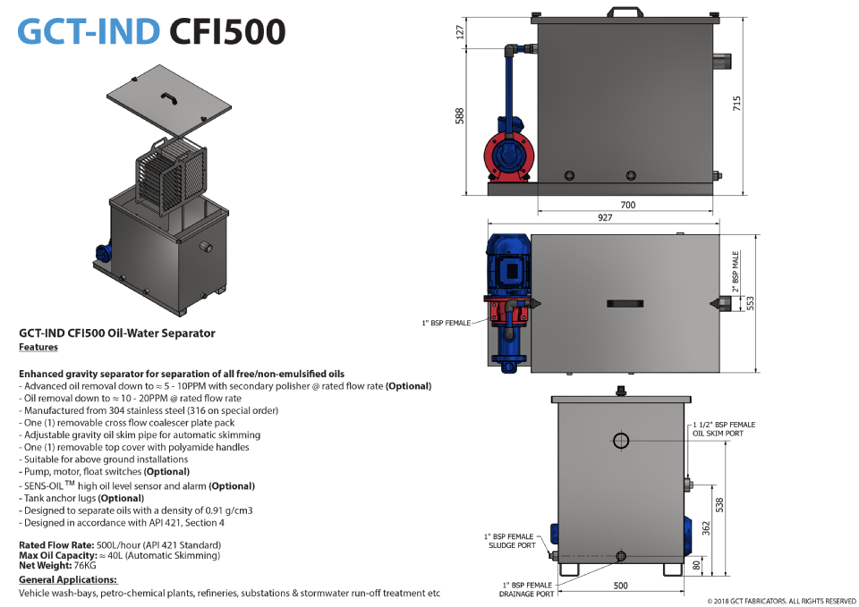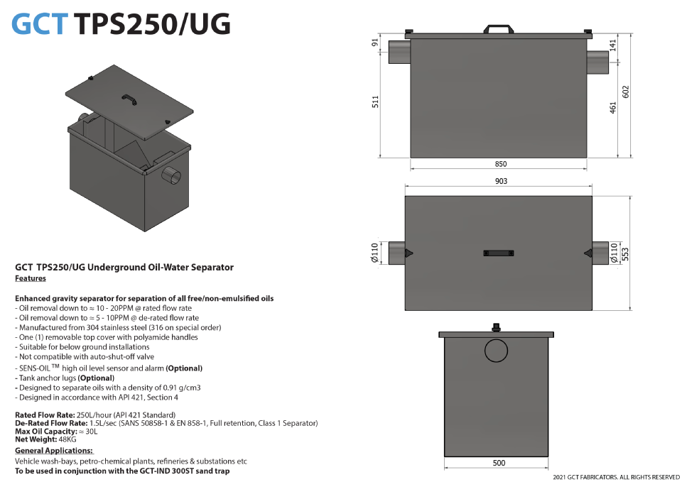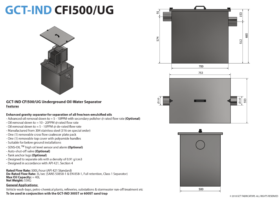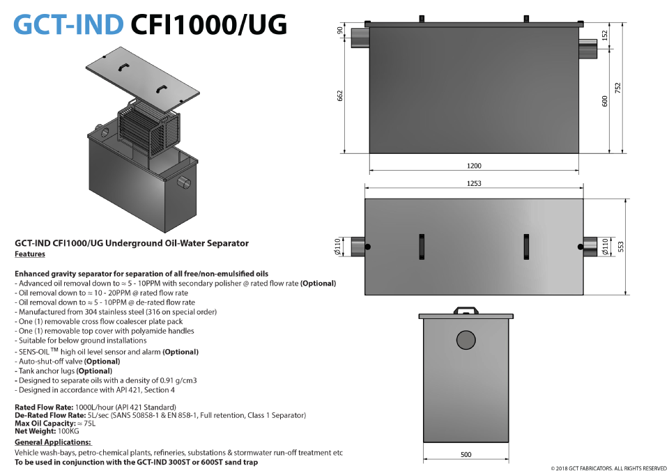 Three standards for the design of oil-water separators are most frequently used throughout the world today, the API 421 (American) standard, the EN 858-1 (European) and the SANS 0252-2 (South African) standard. GCT TPS and CFI oil-water separators are designed and manufactured according to the API 421 standard due to it being the more comprehensive standard between the three. European and South African oil-water separators are designed to remove free oil droplets down to 150 micron based on a laboratory test, whereas American oil-water separators are designed to remove dispersed oil droplets down to 60 micron based on real-world conditions, in conclusion the American standard produces a better quality effluent. The GCT Fabricators range of Oil-Water Separators, a high-performance gravity-displacement separator system is designed and rated to API standards but may be de-rated and used according to EN and SANS standards depending on the application.