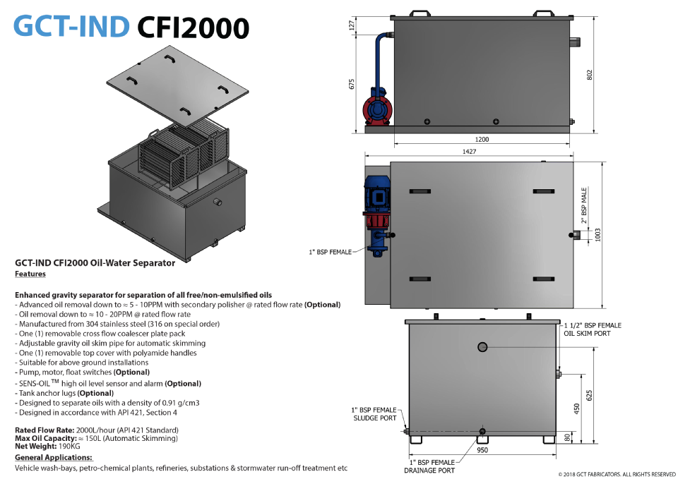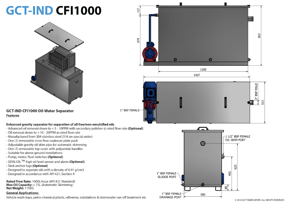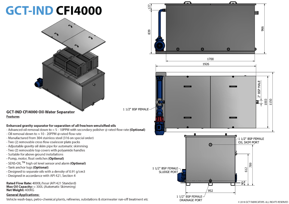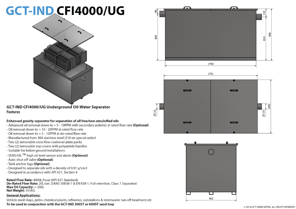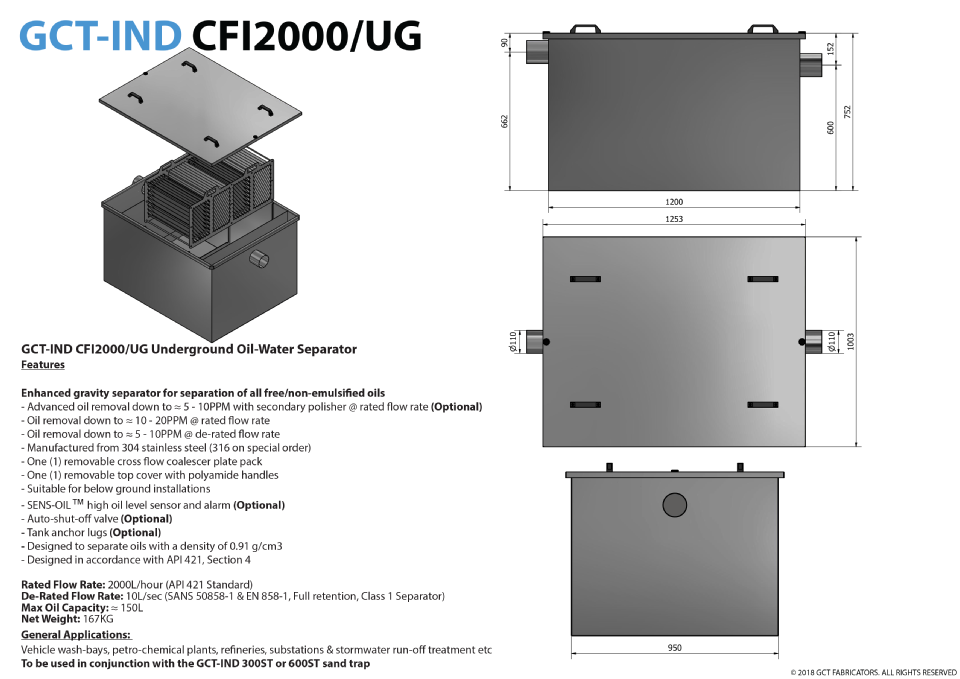 GCT oil-water separators are made from high quality stainless steel making them resistant to any form of corrosion and stain or from high-grade polyethylene. All GCT oil-water separators have been designed by industry professionals and are manufactured in our factory under careful supervision, after which each product is inspected for defects.